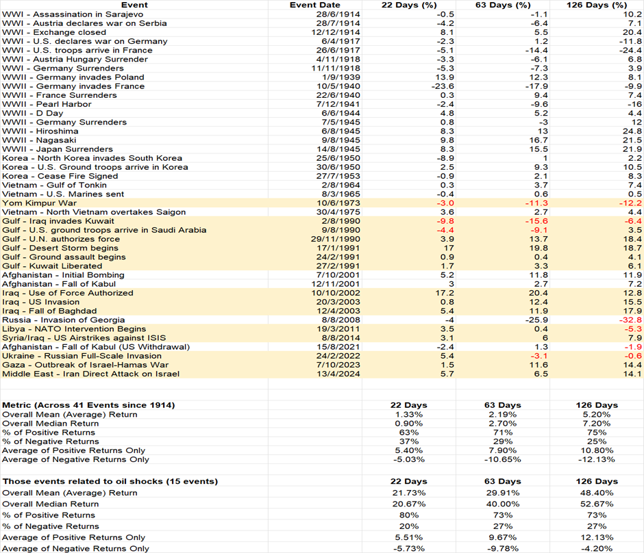 It is easy to be cowered in fear just as it is easy to be lulled into greed. This what makes the stock market function. When we analysed various incidences of conflicts or war since World War I, it is striking the market can look beyond it, most of the time. Across 41 events since 1914, the probability of DJIA Index rising 22, 63 and 126 days after the event is tilted positively with 63%, 71% and 75% of the time with the DJIA rising rather than declining. The average returns of positive outcomes are 5%, 8% and 11% respectively over those time periods. When returns are negative, they are not materially skewed against the positive outcomes. When we further analyse those events that have attendant impact to the oil markets (15 events), the probability of positive returns remained higher than negatives at 80%, 73%, 73% positive returns over 22, 63 and 126 days. The returns of positive outcomes are not dissimilar to the negative returns of 5.5%, 9.7% against -5.7%, -9.8% from 22 to 63 days. But skewed positive after 126 days with average positive returns of 12% versus -4%. Putting them together, there is asymmetry of positive outcomes over the entire series as well as a smaller cohort of events related to oil shocks.