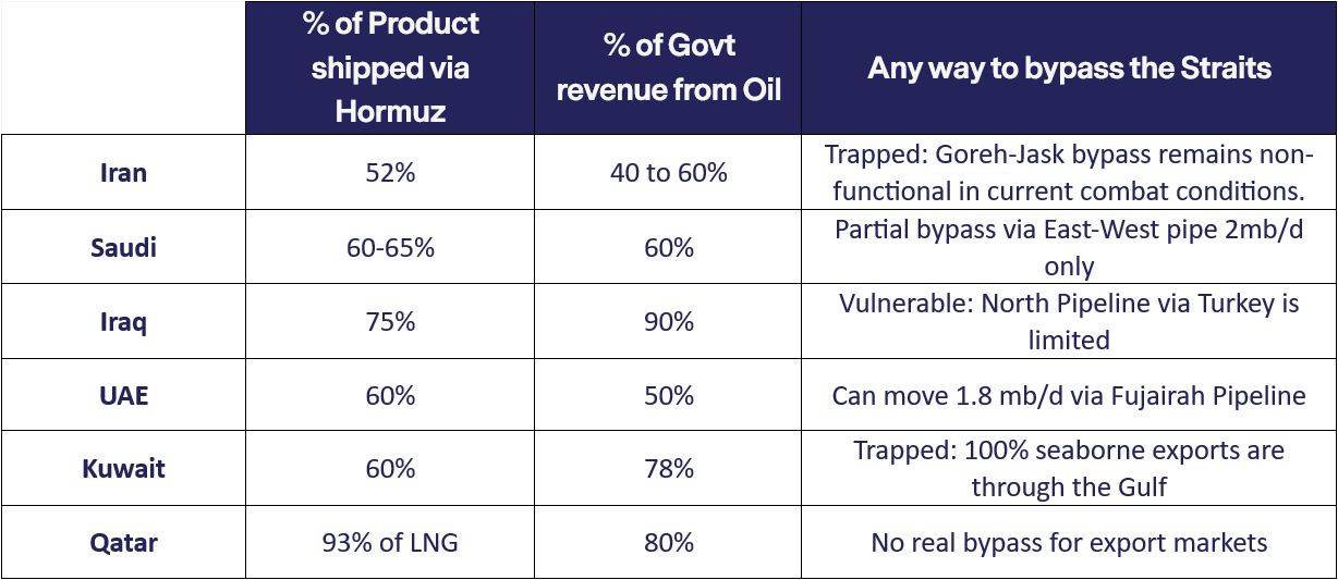 Little is also said that Saudi exports 65% of its oil through the Straits, Iraq 77%, UAE 66%, Kuwait 60% and more than 90% of Qatar’s LNG exports. Each of these countries is highly dependent on oil as revenue ranging from 40 to 90% of their budget. Iran closing of the Straits is not only its own economic suicide, it is a declaration of war on all his neighbours. But it is an ingenious strategy, as Dwight Eisenhower once said, “If you can’t solve your problem, enlarge it”, Iran has intentionally and ironically coalesced friends and foes to wage economic persuasion on their behalf against the protagonists, US and Israel.