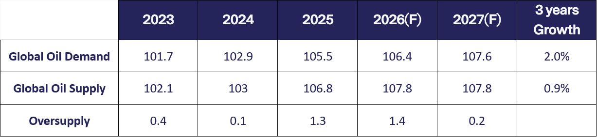 Prior to this war, there was no shortage of oil globally. In fact, the global oil supply was in a glut that lasted 3 years and was expected to increase further in 2026. There is an estimated oversupply of 1.3 to 1.5 mb/d globally driven by supply increases from non-OPEC+ producers that came online in 2023 to 2025 before supply increase abates in 2026 and 2027.