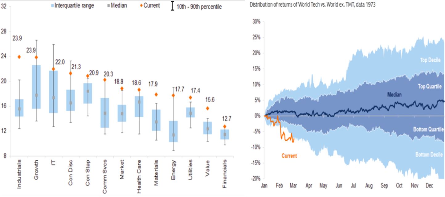 Equities: Remains overweight but vulnerable to growth risk and steep valuations. The equities complex is slightly more complicated than fixed income where yields are high enough to cushion growth and interest rate risks for the latter, but valuations are steep for the former. The current macro regime remains that of Recovery phase even with a modest downgrade from this event, hence, should still favour equities over fixed income. We believe the global economy can withstand 1-2 months of reduced traffic in the Straits but any longer, the transmission mechanism into equities will start to incorporate growth risk but also risk of tighter financial conditions. However, we are seeing interesting opportunities in the tech sector now given that sector has peaked in Oct last year and have corrected ahead of this current war driven by its own idiosyncratic concerns about AI disruption of potential profit pools. Over a 20-year period, tech is now the only sector trading within its interquartile range while the rest of the other sectors are trading closer or above 90th percentile expensive. The year-to-date performance of tech has been the worst it has been in 50 years, and this is extraordinary given that tech sector is forecast to have the highest EPS growth of 45% and 21% 2026-2027 amongst all sectors in contrast to global equities EPS growth of 17% and 14% respectively.