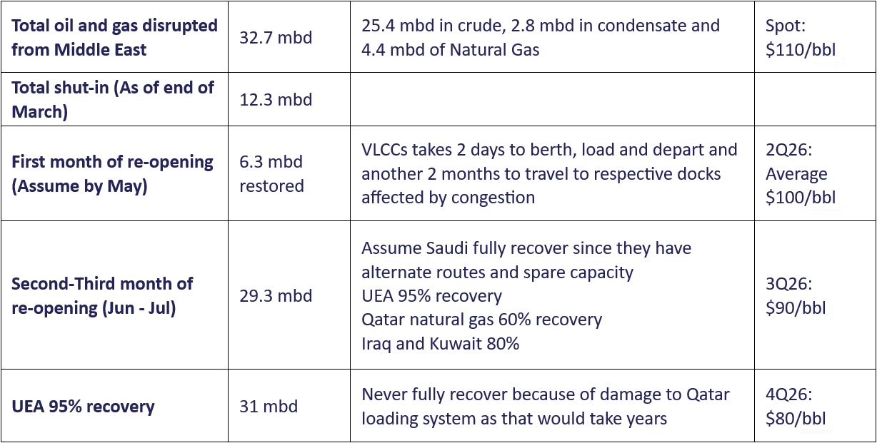We refined our oil calculus. Before the war, the seven Gulf producers supplied 32.7mbd of molecules (25.4 mbd of crude, 2.8 mbd of condensate, 4.4 mbd of natural gas). As of writing, they have been forced to shut-in 12.3 mbd of production concentrated in 12.1 mbd of crude and condensate and 1.2mbd of natural gas. Assuming this is the peak of shut-in ie the war does not spill into a regional retaliation by the GCC, the total cuts in April would amount to 13 mbd. JP Morgan laid out the potential re-opening schedule in the table below. This underpins their oil price assumptions of $100bbl on average in 2Q26, $90/bbl in 3Q, and $80/bbl in 4Q. There are two other important takeaways from their analysis.