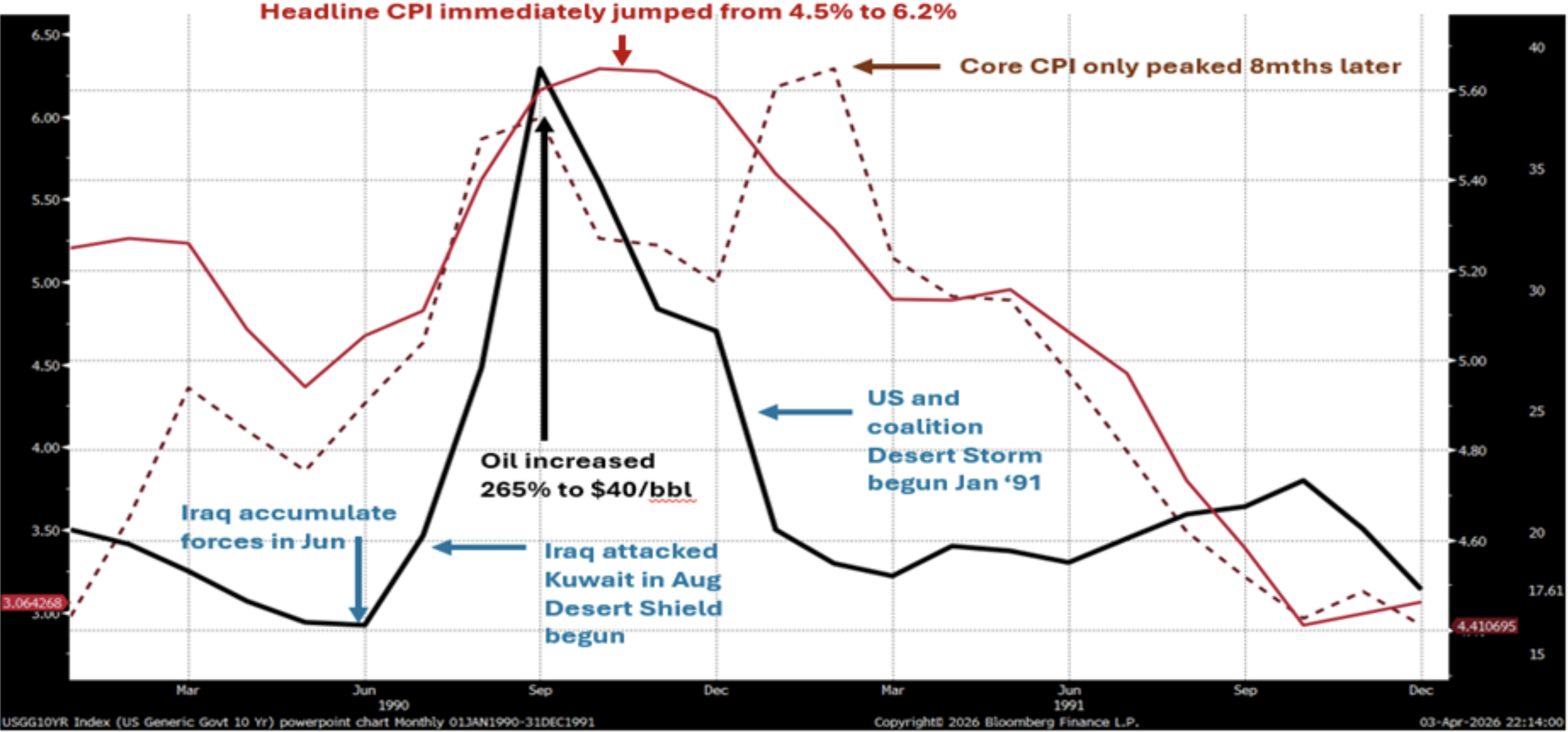 The inflation dynamics is more complex. We learned from the Ukraine-Russia war and the first Iraq war in 1990, the impact to headline inflation is almost immediate, while the inflation measure more relevant to monetary policy, core inflation, tends to be impacted with a lag of 2 to 3 months. None of these figures peaked until several months later after oil peaked. We believe the 1990 Iraq war is a better analogue to understand inflation and commiserating impact on yields and policy responses than the 2022 Ukraine-Russia invasion because inflation dynamic was complicated by post-Covid supply chain and labour shortage interruptions.
