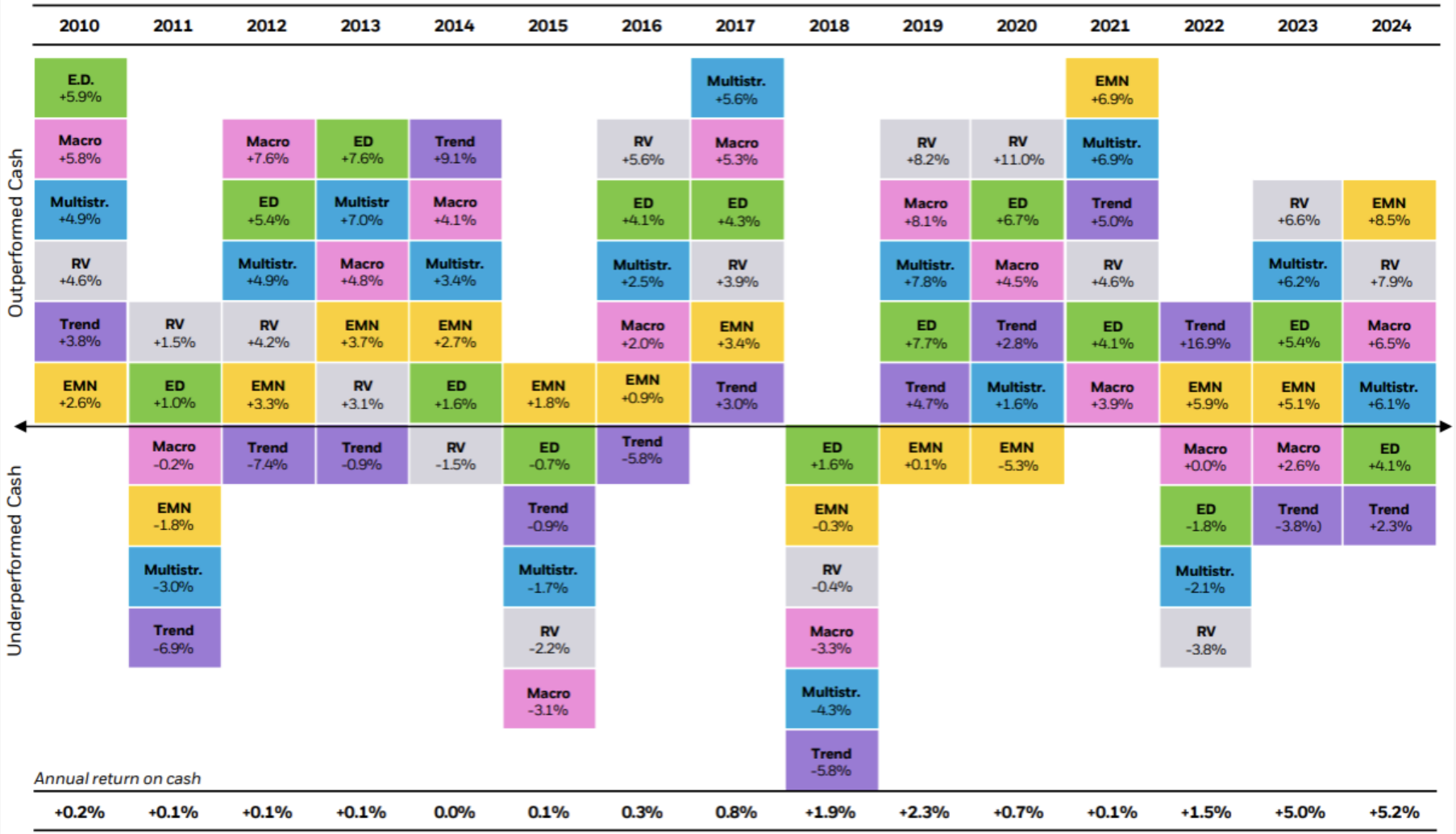 Our global, multi-manager and multi-strategy fund of hedge fund strategy is particularly suited to navigate this kind of macro regime. In fact, empirically, multi-strategy has consistently been the top few performers each year and has outperformed cash as well.